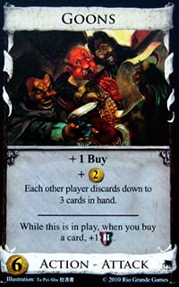 Goons![]() | Action - Attack | $6 | +1 Buy +$2 Each other player discards down to 3 cards in hand. |