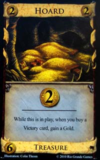 Hoard![]() | Treasure | $6 | >Worth 2 Coins. While this is in play, when you buy a Victory card, gain a Gold |