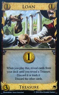 Loan![]() | Treasure | $3 | Worth 1 Coin. When you play this, reveal cards from your deck until you reveal a Treasure. Discard it or trash it. Discard the other cards |