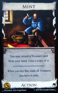 Mint![]() | Action | $5 | You may reveal a Treasure card from your hand. Gain a copy of it. When you buy this, trash all Treasures you have in play |