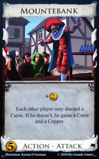 Mountebank![]() | Action - Attack | $5 | +2 Coins Each other player may discard a Curse. If he doesn't, he gains a Curse and a Copper |