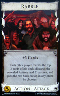 Rabble![]() | Action - Attack | $5 | +3 Cards Each other player reveals the top 3 cards of his deck, discards the revealed Actions and Treasures, and puts the rest back on top in any order he chooses |