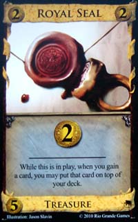Royal Seal![]() | Treasure | $5 | Worth 2 Coins. While this is in play, when you gain a card, you may put that card on top of your deck |