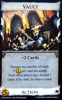 Vault![]() | Action | $5 | +2 Cards Discard any number of cards. +$1 per card discarded. Each other player may discard 2 cards. If he does, he draws a card |