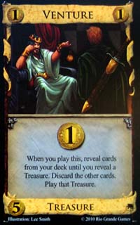 Venture![]() | Treasure | $5 | Worth 1 Coin. When you play this, reveal cards from your deck until you reveal a Treasure. Discard the other cards. Play that Treasure |