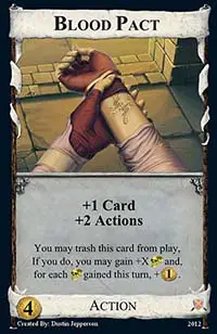 gained this turn, +1 . This effect can be used regardless of if you choose to gain any curse tokens using Blood Pact, but the card must first be moved to the Trash pile. You still receive unused actions, if any, from the +2 Actions for the turn after choosing to trash Blood Pact.