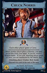 If you play Chuck Norris as a Reaction to another Warrior Card played by an opponent, you are unaffected by the attack and, instead, the opponent (attacking player) gains a curse AND must trash their hand and immediately resolve any gained or lost life points as a result of losing Victory and/or Curse cards.