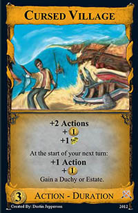 At the start of the next turn after playing Cursed Village, gain a Duchy or an Estate, placing it face up on the top of your discard pile. When you gain a Duchy or Estate card, immediately resolve the Life Point effects (i.e. gain 3 life points for a Duchy or 1 life point for an Estate). If there are no more Duchy or Estate cards available in the Kingdom Card piles, you gain no cards.