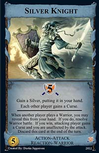 For most Warrior Cards (those with strengths 2-9) when a Warrior Card played in reaction to an attack wins the Warrior battle, the player who played the Warrior Card as a Reaction Card is unaffected by the attack and therefore will not draw a card from the Curse Deck but the attacking player will draw a card from the Curse Deck instead, as described by the following effect: If you win, attacking player gains a Curse and you are unaffected by the attack.