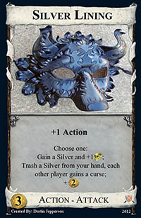 . Silver Lining is only considered an Attack if you choose to Trash a Silver from your hand, after which each other player must draw a card from the Curse Deck and immediately resolve Life Point effects, beginning with the player to your left and moving clockwise until all other players have gained a curse (or played a Reaction card such as Vaccination in response to the attack).