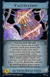 If you do, you are unaffected by that attack and the attacking player must gain a Curse card from the Curse Deck if he or she did not already draw a Curse card as a result of their attack (e.g. from losing a Warrior battle between another player). Any other attack during the same turn is resolved normally - Vaccination only protects against a single attack when played as a Reaction).