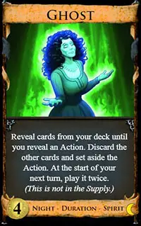 Playing the card does not use up Action plays for the turn. If Ghost plays a Duration card, Ghost will stay out with the Duration card. If Ghost plays a card that trashes itself, it will play it a second time even though the card is no longer in play. If Ghost fails to play a card, it will be discarded from play that turn.