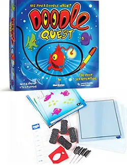 Each player gets a pen, a transparent doodle sheet, and a drawing board. Put your transparent doodle sheet on top of your board.