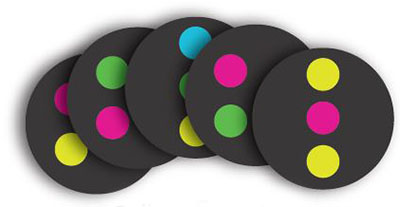 One side of the card matches one side of the colored disks while the other side of the card matches the reverse side of the colored disks. Shuffle the pattern cards and place one in each card holder on either end of the board.