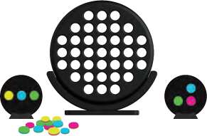The first player to earn 5 pattern cards is the winner. If you fill the board before that happens, the person with the most pattern cards at that time wins. To clear the board, simply lift the vertical playing surface and let the disks fall.