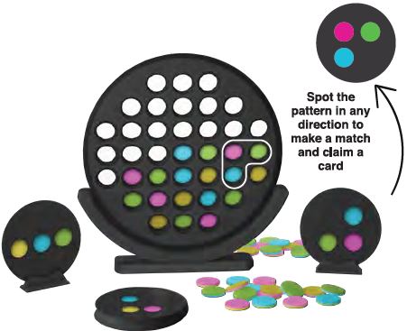 When a match is made, replace the card with a new card and continue playing. If the pattern on the new card already exists on the board, the first person to spot the match can claim the card.