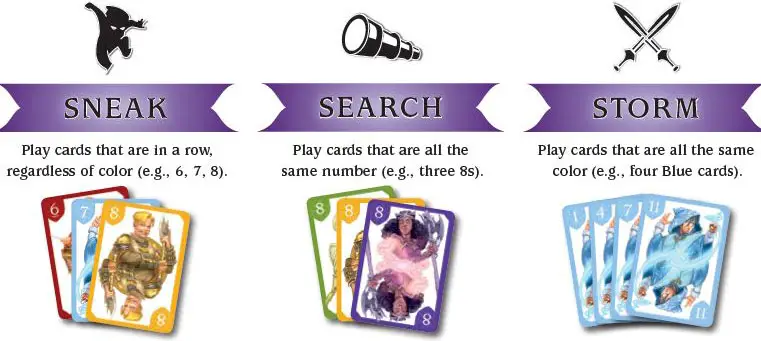 Time for adventure! You may explore one of the face-up locations with one of the following three actions: Sneak, Search, or Storm. To explore, play one to six cards from your hand face-up and announce which location you're exploring and the type of action you're using.