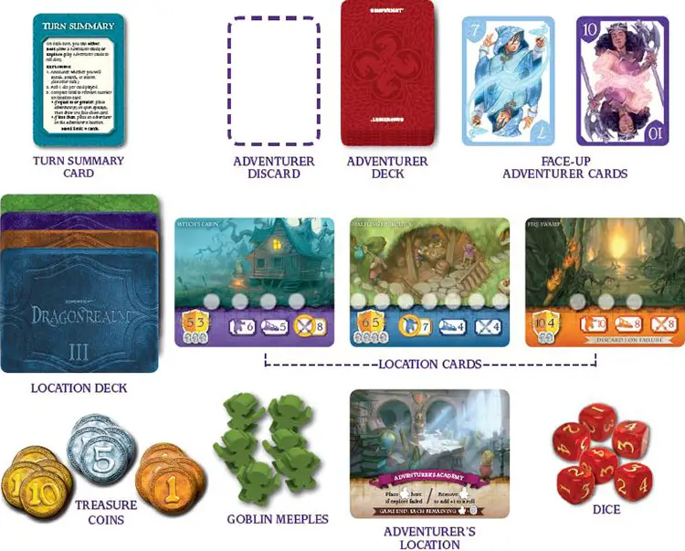 Add adventurers to different locations in the hopes of getting the most treasure. But watch out for goblins who might get there first and grab the treasure before you! In the end, the player with the most treasure wins.