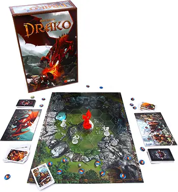 Drako is a two-player only game where one player will lead a team of three dwarves against another player's dragon. The dwarf player must defeat the enemy dragon before all dwarf cards have been played. Each dwarf has their own skills and appearance.