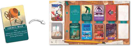 Concrete Mixer - During your turn, before you choose a column of cards to take, you can discard the Concrete Mixer to switch places of two room cards on the game board.