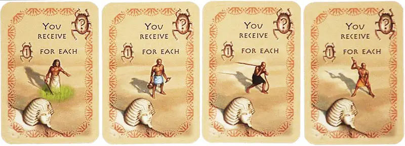 When the game ends, the points scored during the game (mainly building the monuments) are added to the bonuses obtained fulfilling certain conditions on the Sphinx cards. Whoever has the highest total is the winner.
