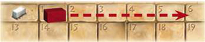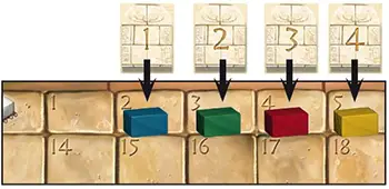 Example: red has stone at the beginning of the 4th phase. He has 2 quarries, which together supply 5 stones each round. He moves his marking stone forward to space 6.