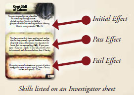 Each investigator has five different skills listed on the bottom of his Investigator sheet. The number below each skill is the number of dice the investigator rolls when resolving a test.