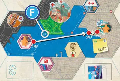 Example: Scar spends 2MP to move to the Heliport Location, and then spends her remaining MP to fly to the Subway. Using the Subway gives her 1 extra MP this turn, and she also uses a Gas can token to get another 1 MP. This allows her to move to the Exit.