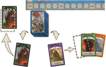 The first two Dragon cards have no effect on play, but when the third Dragon is drawn, the Age immediately comes to an end! Keep the third Dragon card next to the player who drew it, in order to help determine the next Age's First Player in case of a tie for least Glory.