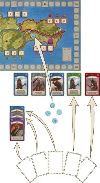 Example: Roderick has his eye on the Kingdom of Duris, so he needs at least one purple Ally. He already has a couple of Dwarves in his hand, so he takes the face up purple Dwarf card. Soon, Duris will be his!