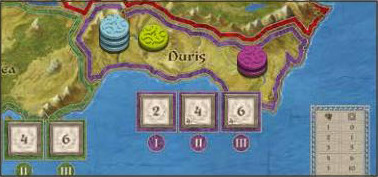 Example 1: Roderick is ready to make his move. He plays all 3 of his Dwarf cards, making sure that the purple one is on top-that's the Leader of his new Band. Since the Leader of the Band is purple, Roderick can place a Control marker in Duris if the Band is big enough. Since he currently has 2 Control markers there, a Band of 3 Allies is big enough for him to place his third marker. Now he's in control of Duris! But will he keep it? Roderick then discards all of the cards still in his hand, placing them with the other face-up cards next to the board.