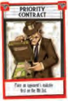 A Priority Contract works the same as a regular Contract card, except that the targeted mobster goes "up against the wall"-the mobster is placed first in line next to the box.