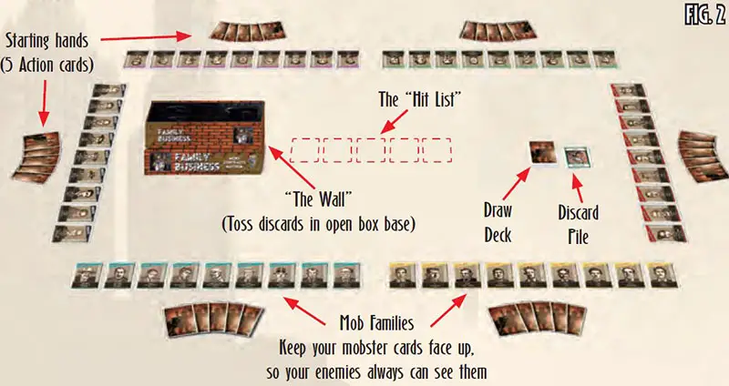 Each player chooses a mob family and takes all of the cards of that family. Toss unused families in the box lid.. Place your cards face up in front of you, so that everyone can always see how many cards you have left. Shuffle the Action cards. Give each player 5 cards for their starting hand. Keep your cards hidden.