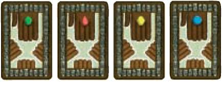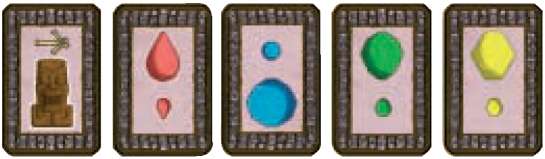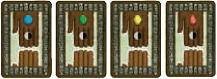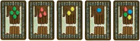 At the beginning of each round, each player takes a complete set of glass beads: 5 green, 4 red, 3 yellow, and 2 blue, placing them behind his screen to hide them from the other players.