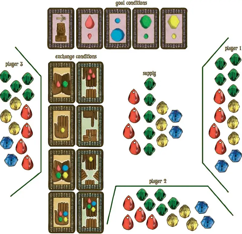 First the player sequence is determined in accordance with the goal cards. All players set aside their screens to show their personal supplies of glass beads.