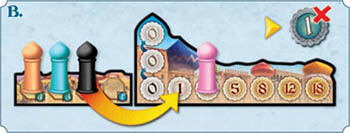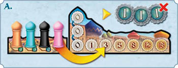 Oliver wants to play early this turn, but he doesn't want to pay too much: he remembers Gold Coins are worth Victory Points at the end of the game. So he decides to go for spot marked "3", paying 3 gold to the bank and placing his Turn marker there.