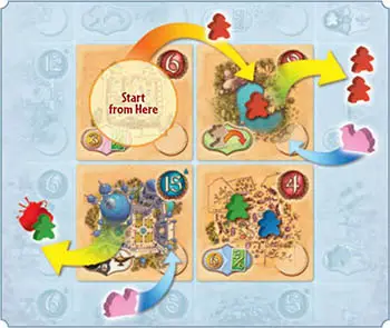 Mix all 30 Tiles and place them randomly face up, to form a rectangle of 5 x6 Tiles: This is the Sultanate 3.