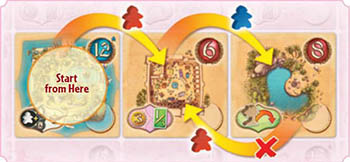 Note: During your moves, you can pass through Tiles that contain no Meeples, dropping 1 Meeple on each as you pass through, but you can NEVER end your move on an empty Tile, since there must always be at least 1 Meeple of the same color as your last Meeple already on that nal Tile!