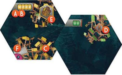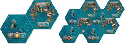 value on the bottom of that stack.Select (or randomly choose) one of those sets of tiles per player, and place these sets along the spaces on the left side of the Guild board, with their Sinkside (teal) faces up.
