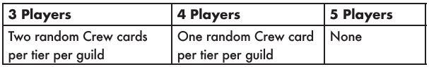 Repeat this process for each Guild, so that every Guild has a stack of Crew cards (Tier 1 on top, Tier 2 on bottom, where each Tier has a number of cards equal to the number of players).