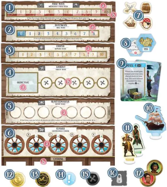 1First Mate Board2Boatswain Board3Cooper Board4Lookout Board5Quartermaster Board6Gunner Board7Ship Stat Markers8Special Location Tokens9Treasure Chest Card10Ship Standee11Pirate Standees12Re-roll Token13Misfortune Token14Constellation Event Token15Threat Token16Lock Token17Player Infamy Markers