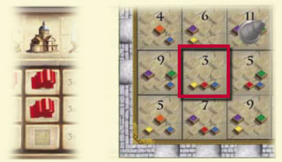 First the active player selects one of the available market booths and then decides to perform one of the two following actions: