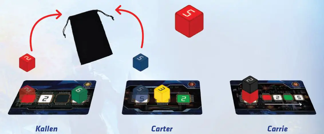 Carter returns his Blue 5 to the bag. Kallen returns his red 2 to the bag. Carrie does not have any 5s, and her only red die is safe because it is not the top die in her stack.