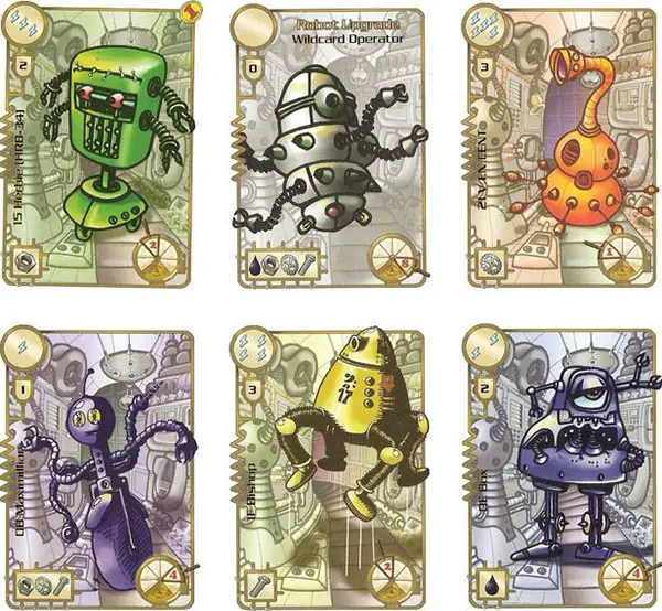 Players take the Robot cards marked with their Mechanic card number, so that each player has a 1 power, 2 power and 3 power Robot card. Together with the Mechanic card, these three cards form the player's hand at the start of the game.