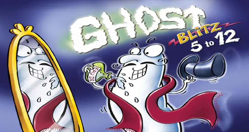 The lightning fast shape and color recognition game that is sure to test the reflexes of kids, families and gamers alike. In Ghost Blitz, five wooden items sit on the table waiting to be caught: a white ghost, a green bottle, a cute grey mouse, a blue book, and a comfortable red chair.