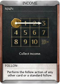 In a 2-player game, each player should also have a standard main income action card. When this card is played, the player collects income (see right).