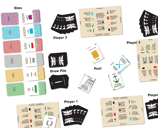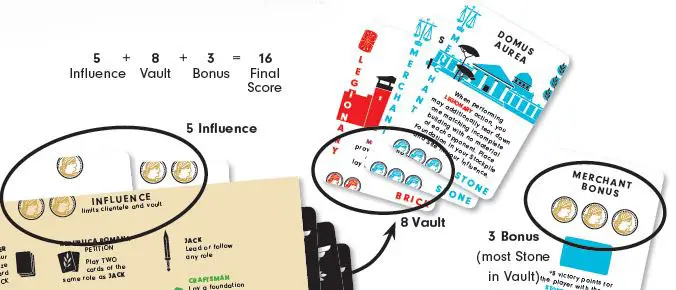During the game you hire Clients and gather Materials to help rebuild Rome (or your personal fortune). Your Camp card organizes your Clients and Materials, and also tracks your growing Influence.