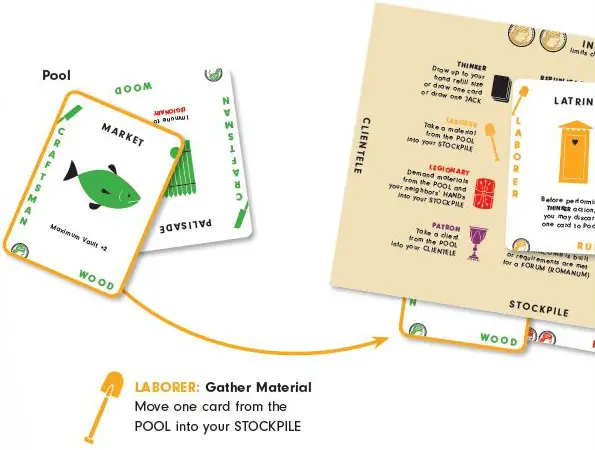 You execute a Laborer Role by taking a card from the Pool (if available) and tucking it underneath your Camp on its bottom edge so that only the Material name is showing. The card is now a Material in your Stockpile.