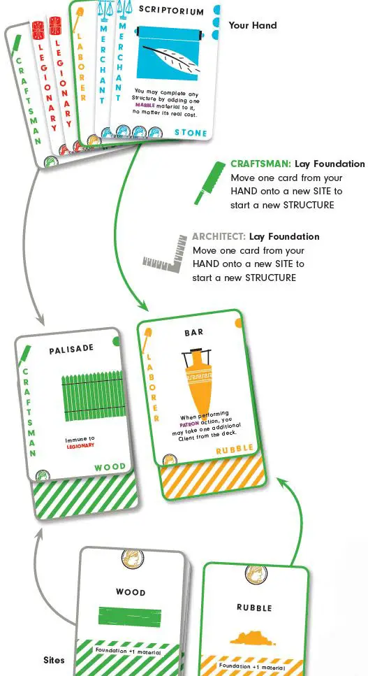 Perform one Architect or Craftsman action to place an Order card from your hand in front of you; it is the Foundation of the Structure you are starting.