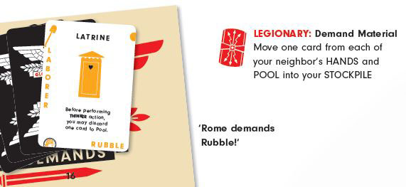 Turn over an Order card (not a Jack) in your hand, and then place your entire hand on the oversized 'Rome Demands' Card so that this Material is showing.